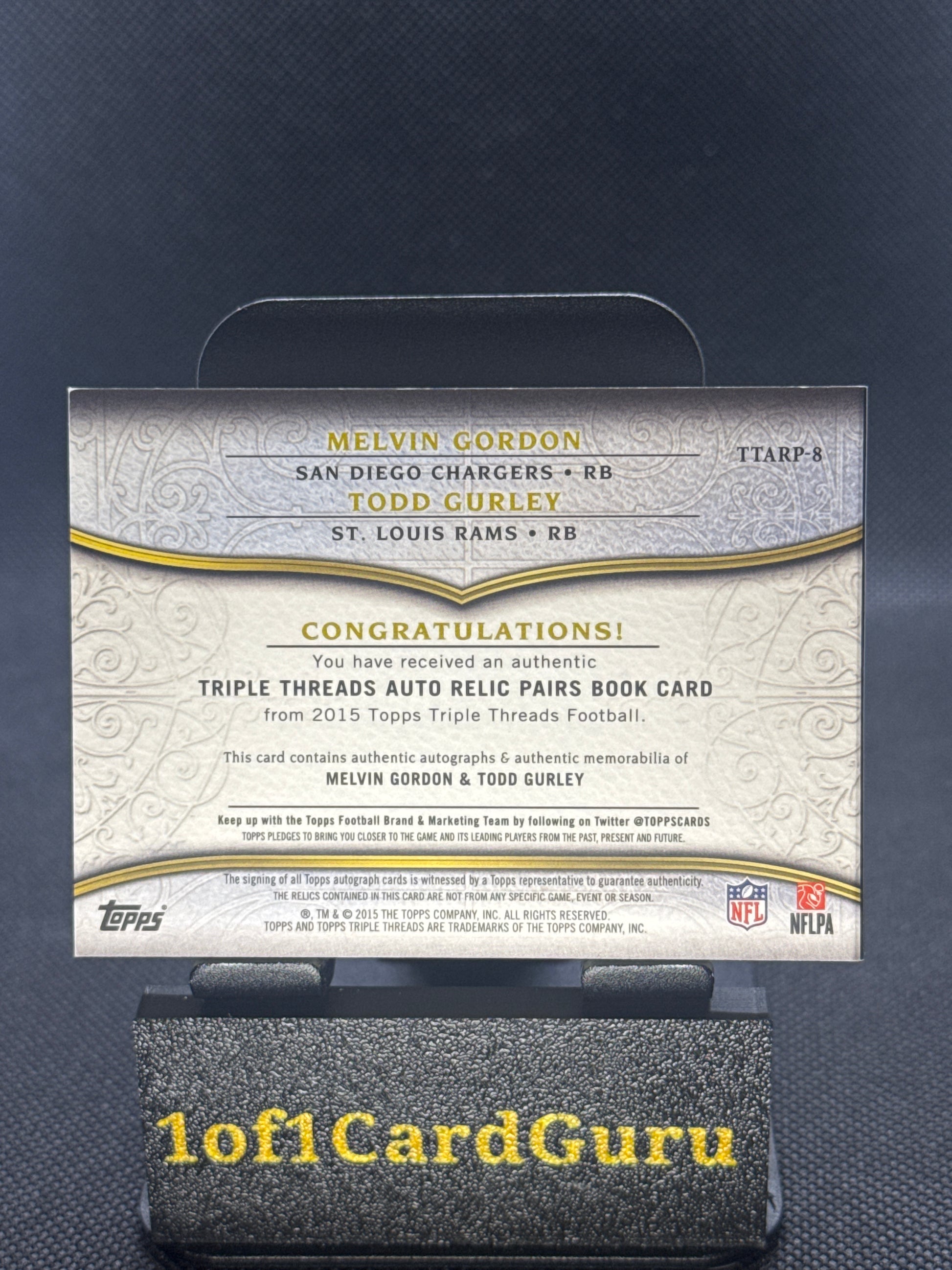 π₯ 2015 Topps Triple Threads Dual Auto Relic Booklet β Melvin Gordon & Todd Gurley β 11/18 π₯ Up for grabs is a rare dual booklet card featuring two of the most electric running backs of the 2015 rookie class β Melvin Gordon and Todd Gurley. β